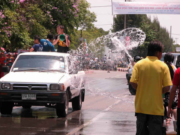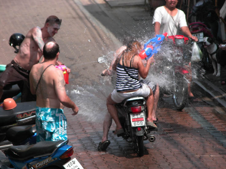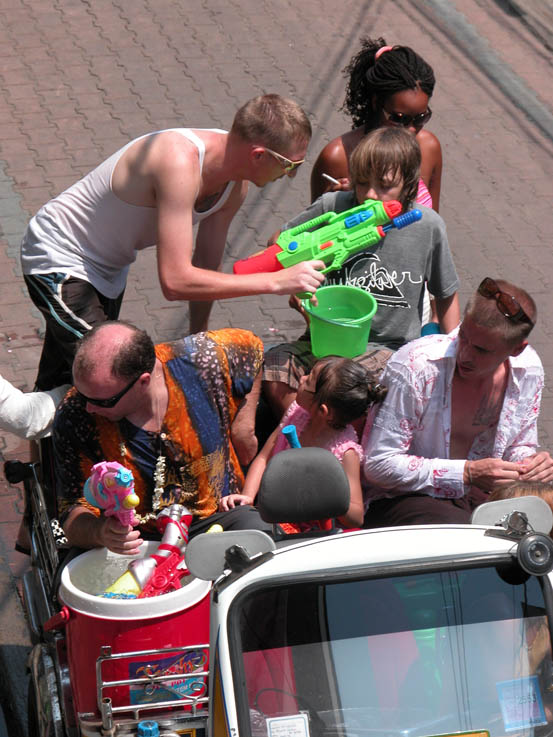 Chow took Gill and I for another round on the tuk tuk – fully equipped with guns and a huge bucket of water with a very large block of ice in it. People here only sprinkle the elders very gently with a tiny bit of water, and the looks of surpise on their faces when Ma Baker shot them with a strong stream of icy cold water was brilliant. On the second round, they were onto us and we wore many bucket-fulls of water in the face, back, head – everywhere. Those miscreants who were mounted on the back of utes usually had ice cold water like us. The canal water thrown by people standing at the side was lovely and warm in comparison. The main street was actually awash and flooding by this stage, which blew us away. It takes an immense amount of work to flood a street bucket by bucket.