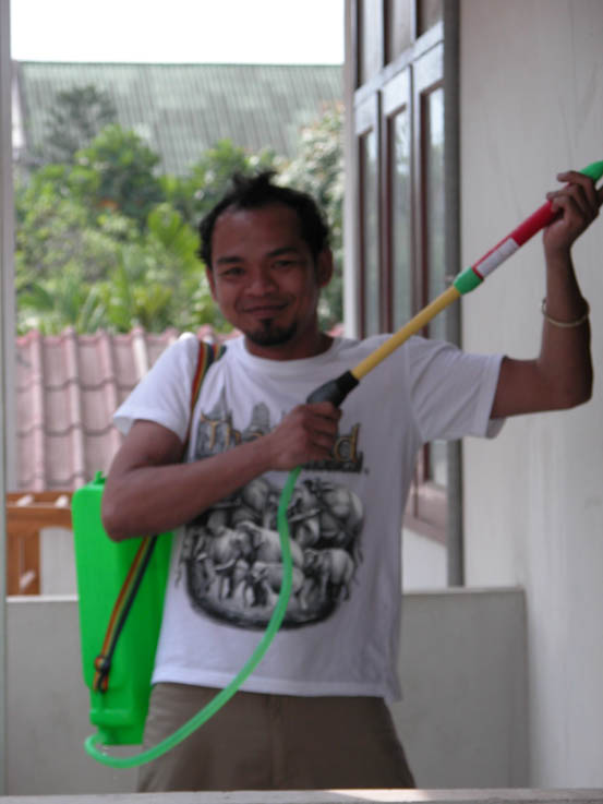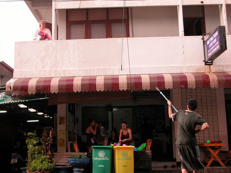 Later in the evening, yet another water battle ensued – after we’d changed into dry clothes, which seems to be a futile activity really. Artist guy had moved his stereo system to the Nice Kitchen front yard and it’s been on full volume the whole evening. Gill watched some older woman give the locals a telling off about the loudness of the music then get drenched by a bucketfull as she stepped back out on the street. Gill thought it was hysterical and apparently everyone around her was falling about laughing. It really is ridiculous to be serious at a time when every man and his dog is celebrating and having such a good time. People like that need to learn to stay inside their homes during Songkran.