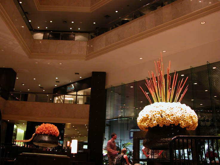 It took aaaaages to get to our hotel. Every traffic light here seems to stay red for about 10 minutes. When we got to the hotel, feeling absolutely knackered, the receptionist proved my theory on the snootiness of the night reception staff being in direct proportion with the poshness of the hotel. And this one had a huge lobby lined in black marble and several floors of balconies above us – all thanks to Gill’s one-night holiday arrival splashout combined with a complimentary second night’s stay. When you’re feeling that tired and it’s 5 o’clock in the morning at your place in New Zealand, it’s amazing how uncivilized you can suddenly feel. I began to have visions of leaping across the counter and slapping her face by the time she gave us our room cards. We tried to find out what floor room 2327 was on, but by the time she repeated it a third time and we still didn’t understand, we removed ourselves (before she slapped us) and bluffed it until we made it. (Yes, it was on the 23rd floor. But hey, we’re two blondes and that doesn’t make life easy you know.)