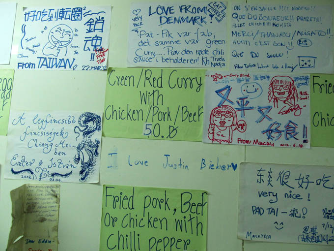 Down the road for dinner, and we found the ‘Best Place in Chiang Mai’ cafe, which had testimonials on A4 paper stuck all over the walls from previous, international diners. And, as it turned out, the moniker is well-deserved. Their food was yummy!! The service was great too – very friendly. Ursula had a fried rice and I had Pat Si Yu – fried noodle, sweet sauce, chinese broccoli and pork. For 40 baht – about $1.80, I think. Might go back there for breakfast I think – after I buy my dragonfruit from the lady round the corner, which I promised her I’d do.