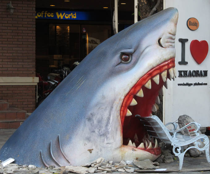 Khao San road is a funky, offbeat backpackers, market area that has been going years and has hardly changed since I first saw it in 2005. You can have ‘very stong cocktails’ for 100 baht at places where people stand on the street with placards saying ‘We don’t check ID’. You can also save yourself a lot of time and buy a degree in the subject of your choice. Street carts are everywhere selling delicious kebabs or fruit shakes or Pad Thai for 20 – 30 baht, ladyboys – absolutely gorgeous ones – trip about in high heels, flicking the hair of their long wigs back in windswept and interesting ways, and hill tribe women swarm about making croaking noises with wooden frogs which they will try to stuff up your nose at any given opportunity. This all goes on to a background of thumping house music and neon signs. An interesting place and yet sort of tired and cynical around the edges, if you know what I mean.