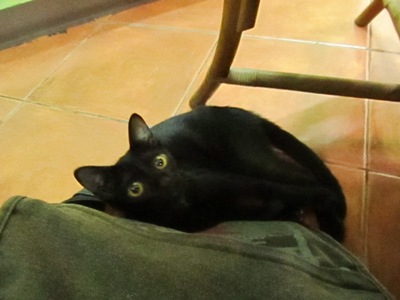 Back to our room again for another cold shower (which turned out to be tepid due to the outside temperature, so essentially we were now just hot and wet), and the mandatory quality control test for the wine coolers. We were joined by a mad little black cat that talked really loudly and took an enormous liking to Peter, his bag, his lap, his feet and any other uncovered areas of skin and his glass of alcohol. City cats, pfft!