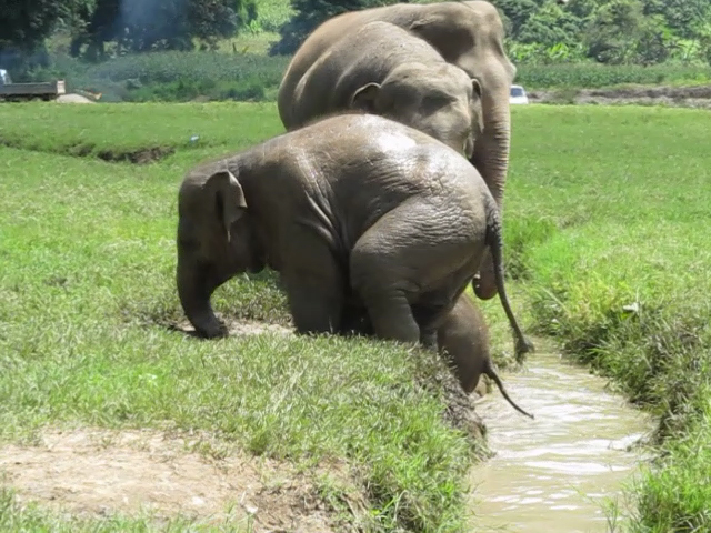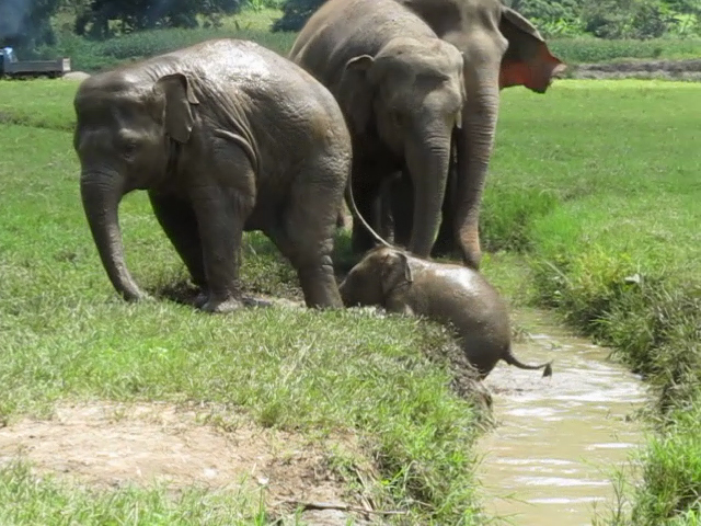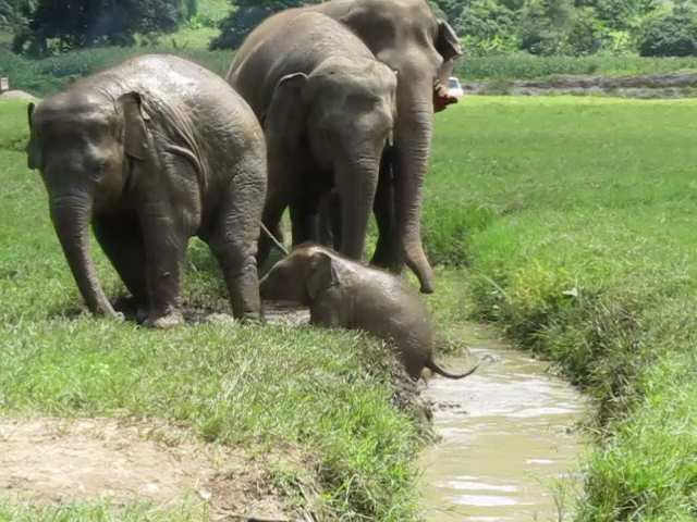 While I was at Elephant Nature Park, Jodi and I happened across Faa Mai and a few of her friends indulging in some ditch-diving. Faa Mai was enjoying herself so much she got in and out about three times. Little Dok Mai was very happy to copy what her big herd-sister was doing. Here’s some of the footage I got…