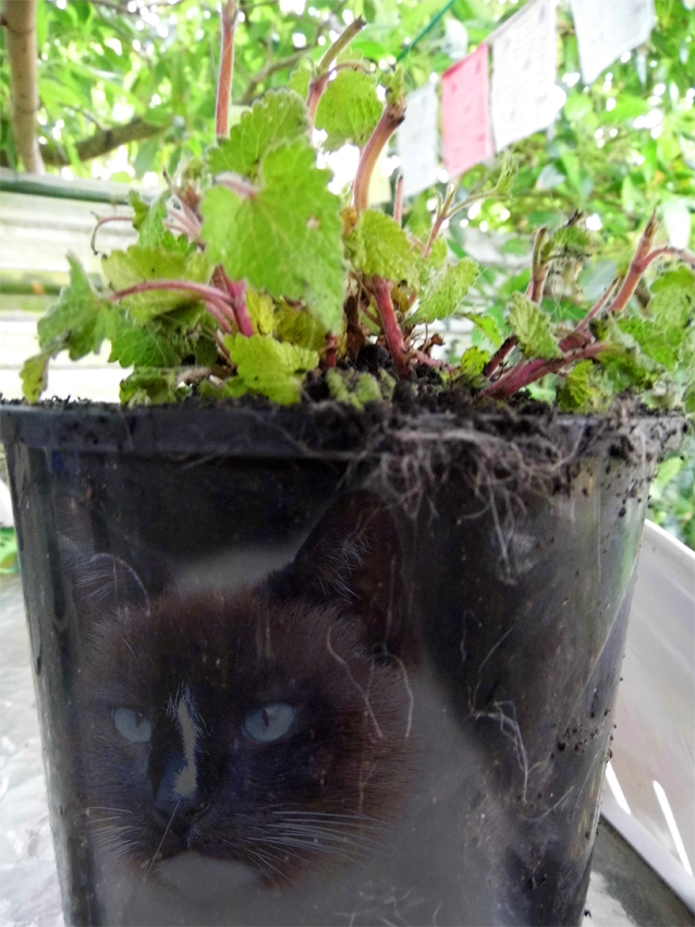 So, big meanie that I am, I repotted it and put it in a place that would be very awkward for even the most determined feline to reach. And it’s right under my bedroom window, so I’ll be able to hear any catsneakery that goes on.