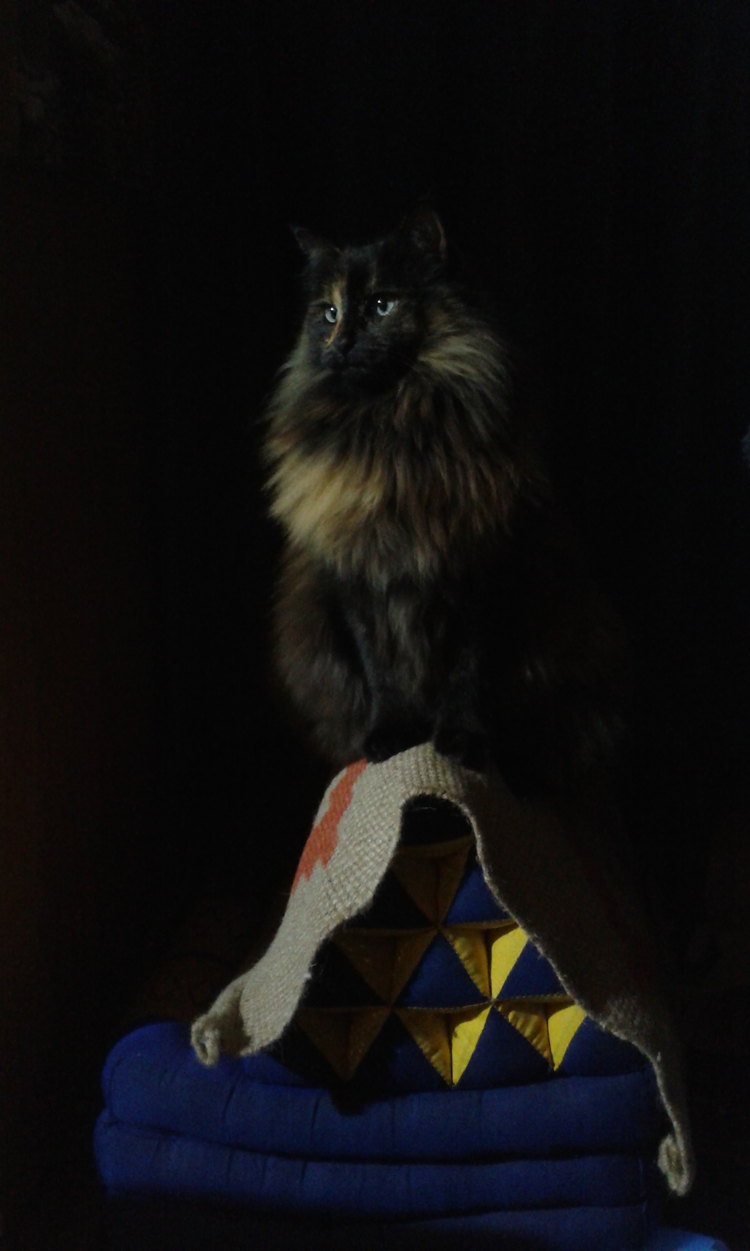 Well, that’s the way it was until a certain little furry beastie came to live with me a wee while ago, and guess what?! She loves that cushion! She races inside, does a slidey cornery manoeuvre and leaps up onto its apex, there to look about with smuggishness and joyful abandon, and rule the world. And thus the cushion has finally realised its purpose in life and has been dubbed the great, the resplendant, the anthropometrically feline-pleasing Cat Mountain.
