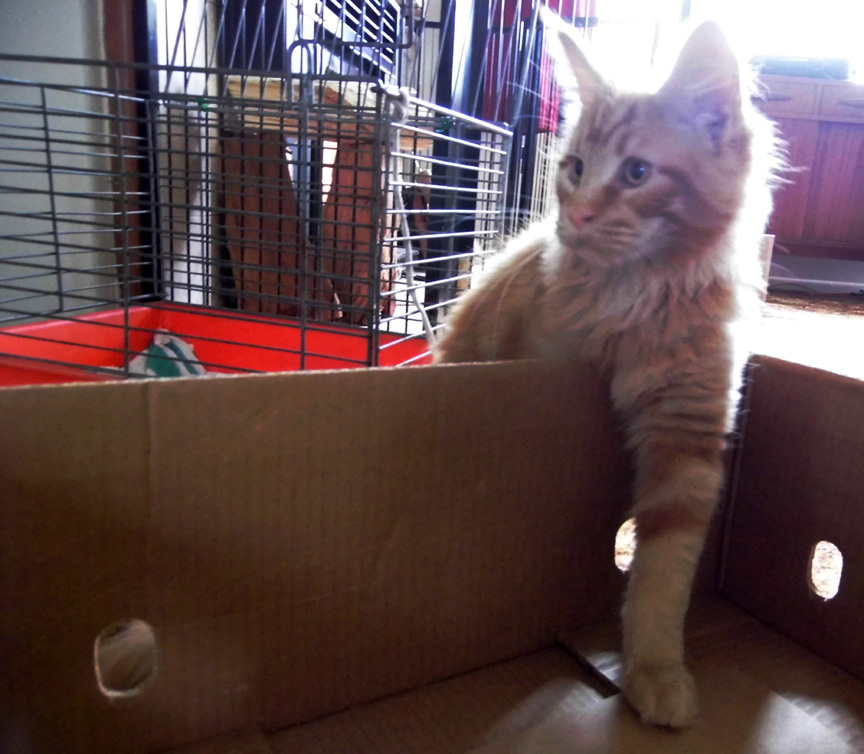 This is Rose – one of the kittens I met on that fateful day that was the beginning of our own servitude. Rose completely rules her owner already, the house, the dog, the child and all things made of paper and cardboard. She has the typical Maine Coon features of pointed ears, long tail, long whiskers, big paws and a need to be involved with everything that is going on. At only a few weeks old she’s already quite large. She will grow until she’s four or five years old.