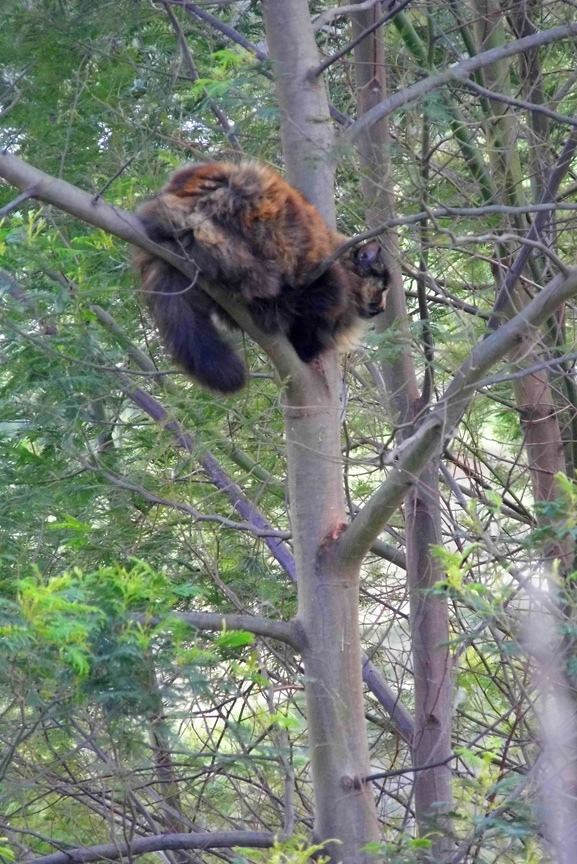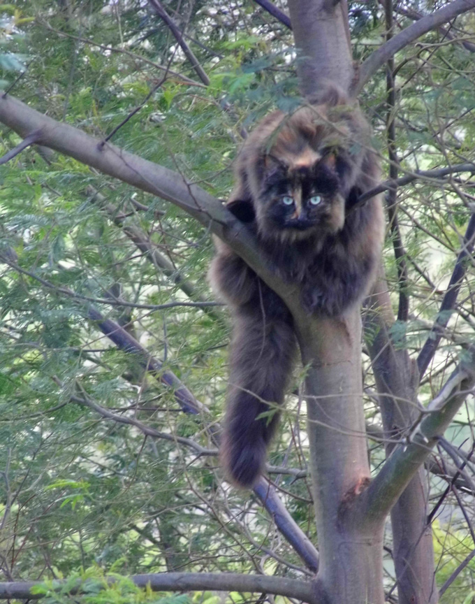 We woke up one morning and couldn’t find Smudge anywhere. A few more grey hairs were developed while running around calling her for ages and worrying ourselves silly that she was okay. Then her other servant called to my attention a creature sitting very high up in one of the tallest trees in the neighborhood. Sometime during the night, Smudge had decided that she should be a tree bear. By the time we found her though, she looked like she’d had enough of being an arboreal-type animal and wanted to come down.