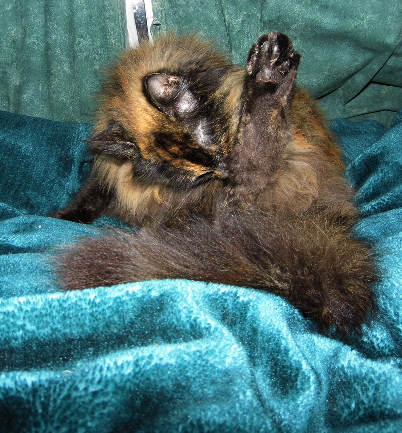 Smudge stayed in bed all day today. And adopted the long turkish cushion in the corner of it. I introduced the brush to her, very gently, and she loved it! She rolled over onto her back and demanded that I do her tummy. A lot. I was kinda touched, as that’s a very trusting thing for an animal to do. So she was able to really milk that one!