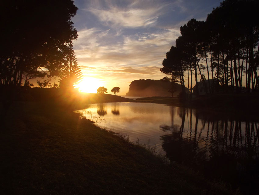 A duck pond at the local park, host to many frogs and ducks. A great place to walk by a little while before dusk. Whangamata, Coromandel, North Island.