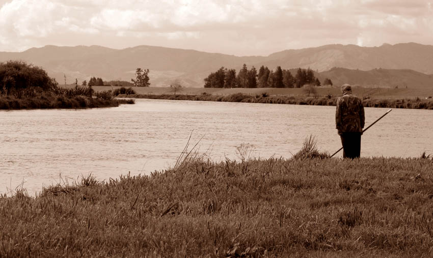 Fishing – favourite pastime of many a Kiwi bloke. I strongly suspect that in many cases it’s used as a fairly legitimate excuse to get out of the house… Looking towards the mountain ranges on the way to Thames, from the Hauraki Plains. Coromandel Peninsula, North Island.