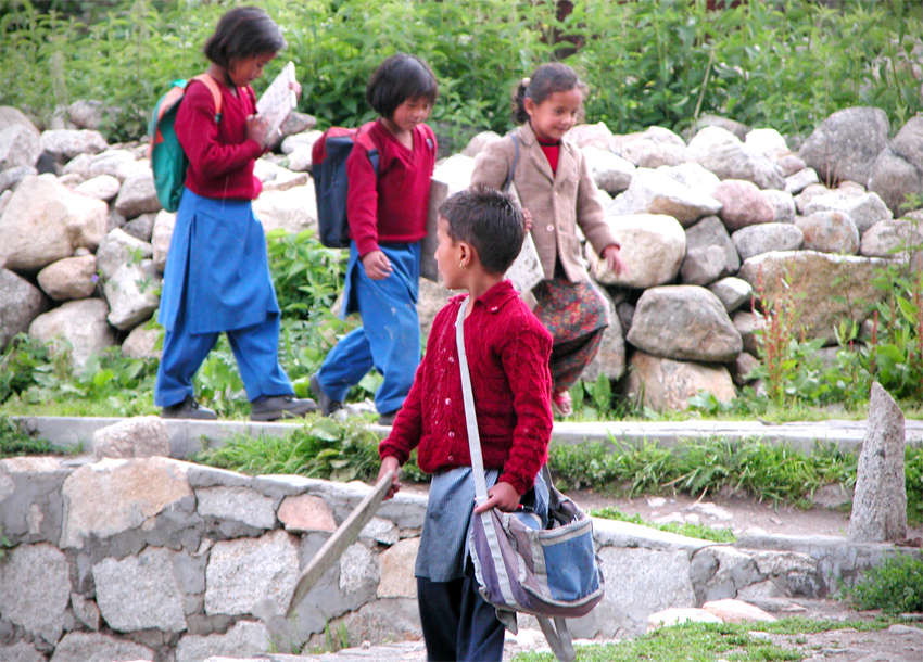 Once having moved and sated ourselves with food and chai, lolled and gloried in our new-found grandiosity, we trotted off down to the village to visit the little school we had walked past many times. We were invited in and offered a seat with the utmost of politeness, and then the schoolteachers looked at us as if to ask why we were there exactly. Finally, the message got through that we were indeed ensconced in the wrong school. Bugger! I knew immediately what was going to happen. I had witnessed older school children coming up the hill from the river, when sitting at “The Great Hindustani Dhaba” sipping on chai. Indeed, I had glanced down the hill when going past one day. Right at the very bottom, way way way down there, was a building. And sure enough, it was confirmed that this was indeed the other school – the Chitkul High School (which in this case was a Definate contradiction in terms. God laughing again?…). And we all know when you go down, what happens when you want to go in the opposite direction? You go UP. Dammit! I HATE hills when I have to walk up them. My partner doesn’t seem to have the same aversion to inclines that I have, and laughed at me when I wondered aloud if there were any donkeys for hire. Grrr. It’s disgusting how he almost skips merrily uphill while I stop every minute or so to puff and gasp, almost strangled from lack of oxygen. Who would’ve thought my ancestors come from the Highlands of Scotland while his come from comparatively flat Ireland.